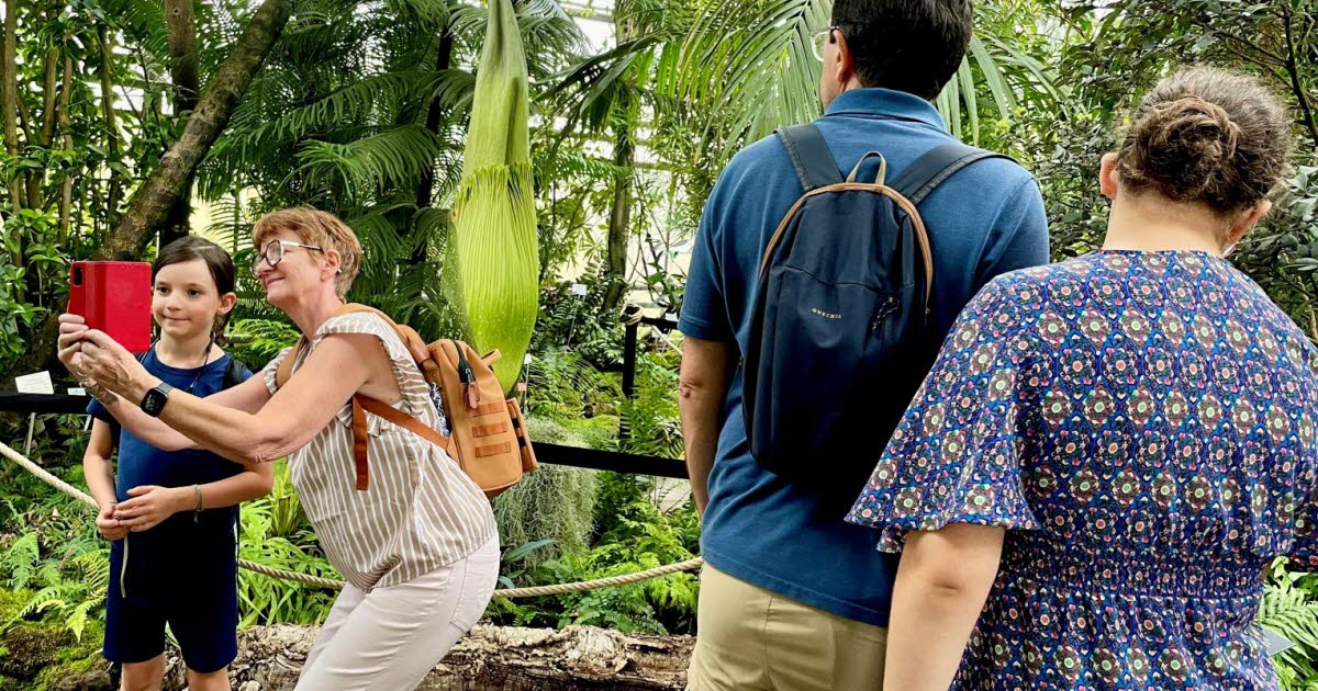 Tintin l’arum titan, alias amorphophallus titanum de son vrai nom scientifique (pénis ou phallus de titan pour les intimes) a légèrement détrompé les pronostics qui annonçaient sa floraison possiblement dès cette semaine. Or pour l’instant, il se « contente » de grandir. Et ne devrait donner le meilleur de lui-même qu’en début de semaine prochaine. « A priori plutôt lundi 28 juillet, dimanche nous paraît peu probable », prophétise Frédéric Pautz, directeur du Jardin botanique Jean-Marie-Pelt, où est attendu l’événement.